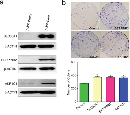 Figure 4: Foci formation ability of SLC30A1, SERPINB2 or AKR1C1 ectopically and stably expressed in NIH3T3 cells. a. Establishment of NIH3T3 cells stably expressing SLC30A1, SERPINB2 or AKR1C1. b. Colony number (mean ± SE) of cells with ectopic expression of each of the three genes. *, P < 0.05 compared with vector control.