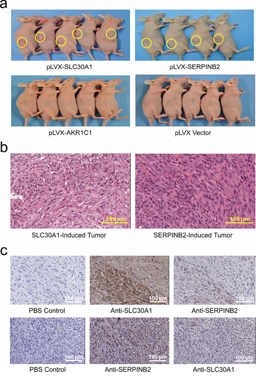 Figure 5: Xenograft tumor formation in nude mice of NIH3T3 cells ectopically and stably expressing SLC30A1, SERPINB2, AKR1C1, or vector control a. Histological analysis showed that all tumor cells had similar morphology and were diagnosed as fibrosarcoma b. Immunohistochemical staining c. demonstrated a high expression of SLC30A1 (up panel) or SERPINB2 (lower panel), respectively, in tumors induced by each of these two genes.