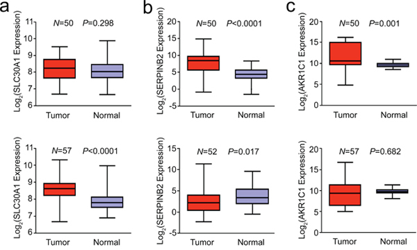 Figure 6: Aberrant expression of SLC30A1 a. SERPINB2 b. and AKR1C1 c. in human lung cancer and paired normal tissues (up panel, squamous cell carcinoma and lower panel, adenocarcinoma). Data were retrieved from the TCGA database.