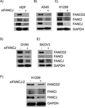 Figure 1: Down-regulation or loss of FANCJ concomitantly diminishes FANCD2 and FANCI proteins in multiple cell lines. HDF A., A549 B., H1299 C., OV90 D. and SKVO3 E. cells were transfected with control or FANCJ siRNAs. After 48 hours whole cell lysates were collected, normalized for total protein concentration, and assessed for the levels of FANCD2, FANCI, FANCJ, and GAPDH proteins by Western blotting. F. A second, previously validated, FANCJ siRNA (FANCJ-2) was used to verify that the effects were not the result of non-specific interactions of the original siRNA.