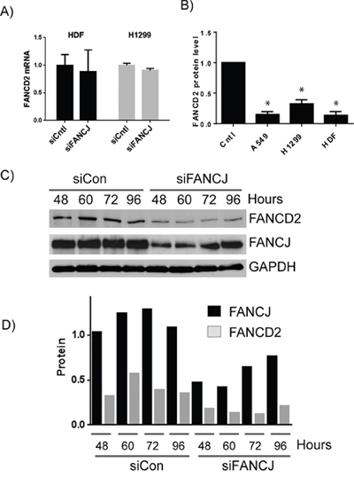 Figure 2: FANCJ regulates FANCD2 concentration at the protein level. A. Total mRNA was isolated from HDF and H1299 cells transfected with control or FANCJ siRNAs. The levels of FANCD2 mRNA were analyzed in triplicate and normalized to GAPDH message. Error bars represent standard error of the means for all samples. No significant differences were noted between siCntl and siFANCJ samples. B. FANCJ was depleted in several cell lines in multiple independent experiments (between 5 and 7 for each cell line) and FANCD2 levels were quantitated by Western blot and averaged. Error bars represent standard error of means of all experiments. * indicates the value is significantly different from control sample (P < 0.05). C. To determine if FANCD2 levels mirror those of FANCJ or if loss of FANCJ leads to irreparable loss of FANCD2, FANCJ was depleted from H1299 cells by siRNA, and both FANCJ and FANCD2 protein levels were monitored over time (96 hours) until both began to increase. D. Densitometry of the time course for 1 representative experiment of three independent samples. FANCJ is represented by black bars and FANCD2 protein by gray.