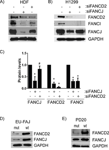 Figure 4: FANCJ regulates FANCD2 stability, but FANCD2 has little to no effect on FANCJ protein levels. A. HDF or B. H1299 cells were transfected with siRNAs for either FANCJ or FANCD2 and the levels of FANCJ, FANCD2, and FANCI were measured by Western blot. C. The average values of FANCJ, FANCD2, and FANCI in cells treated with siRNAs for FANCJ or FANCD2, from at least three independent experiments, were normalized to the levels in H1299 cells treated with control siRNA. Bars represent standard error from multiple (3–4) independent experiments. * indicates the value is significantly altered from control (P < 0.05). # indicates that FANCJ levels are significantly different between cells treated with siFANCJ and siFANCD2 but not changed from control (p < 0.05) indicating that depletion of FANCD2 does not substantially alter FANCJ levels. D. FANCJ-deficient EUFA30 and the FANCJ-corrected counterpart cell line were examined by Western blot for expression of FANCD2. E. FANCD2-deficient PD20 and its FANCD2-corrected variant were analyzed by immunoblotting for FANCJ.