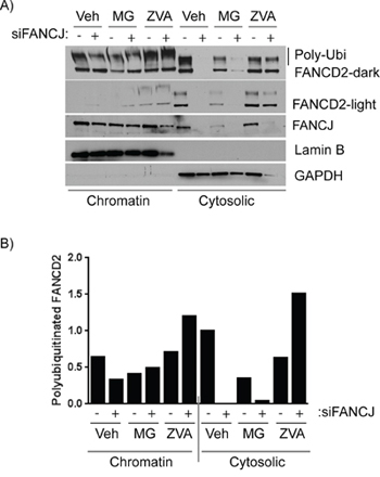 Figure 6: FANCJ deficiency compromises the stability of FANCD2 in both cytoplasmic and chromatin fractions. A. H1299 cells were transfected with control or FANCJ siRNAs, treated with the DMSO (Veh, vehicle) or ubiquitin proteasome inhibitor MG-132 (3 μM) or the panCaspase inhibitor Z-VAD-FMK (10 μM) for 12 hours prior to harvesting. Cells were then fractionated to separate cytoplasmic and chromatin-associated proteins. These protein fractions were examined by Western blot to analyze the effect of the protease inhibitors on FANCD2 degradation. Stabilization of high molecular weight FANCD2 (polyubiquitinated) in both chromatin and cytoplasmic fractions were observed in cells treated with Z-VAD-FMK. Lamin B1 and GAPDH serve as controls for efficient separation of chromatin-associated and cytoplasmic proteins, respectively. B. The large polyubiquitinated (from dark exposure) FANCD2 bands were quantitated and normalized to Lamin B1 for chromatin-associated extracts and GAPDH for cytoplasmic proteins. The quantity of each protein in the vehicle-treated control sample was nominally set to 1 to allow easier comparison.