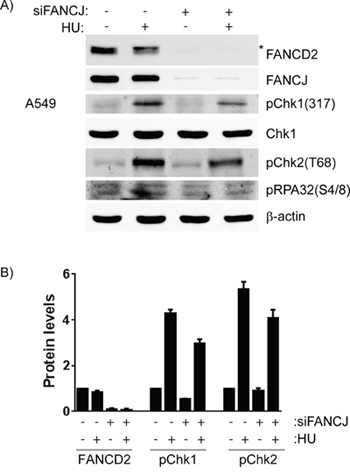 Figure 8: Cells lacking FANCJ are unable to properly respond to DNA damage caused by stalled replication forks. A549 cells were transfected with control or FANCJ siRNAs twice with 24 hours interval. After 48 hours post-transfection, cells were treated with DMSO or Hydroxyurea (2 mM) for 4 hours. A. Whole cell lysates were assessed for FANCD2 and indicated DDR proteins by Western blot analysis. * indicates monoubiquitinated form of FANCD2. B. Protein levels of FANCD2 and activated DNA damage checkpoint kinases, Chk1 (S317) and Chk2 (T68) were measured after normalizing to β-actin, in control and FANCJ-depleted cells. Error bars represent the standard error of 3 independent experiments. Hydroxyurea treatment caused significant increases in phosphorylation of both Chk1 and Chk2, and both were substantially diminished by FANCJ depletion.