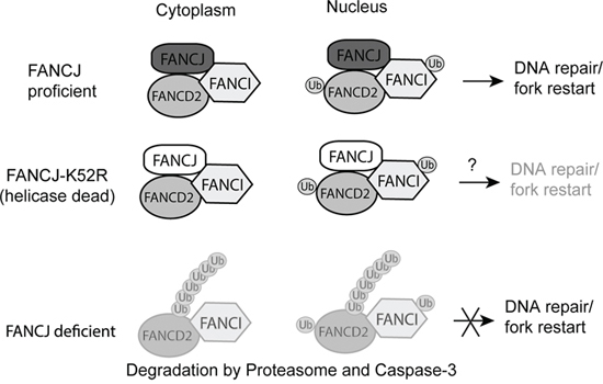 FANCJ and FANCD2 interact with each other and the majority of the interaction occurs in the cytoplasm, as most of these proteins reside in the cytoplasm in undamaged cells (Figure 6A). This suggests that FANCJ sequesters FANCD2 away from the DNA in undamaged cells. This interaction does not require FANCJ to be capable of hydrolyzing ATP or having its DNA helicase activity. The K52R FANCJ mutant could interact with FANCD2 and protected it from degradation as efficiently as wild-type protein (Figure 7C). The K52R FANCJ has no detectable ATP hydrolysis activity or DNA helicase activity [40] and was more susceptible to certain types of DNA damage and caused a delay in repair of DSBs [40]. The physical interaction between FANCJ and FANCD2 protects the latter protein from degradation through the ubiquitin proteasome and caspase-3, maintaining the protein in a state of readiness to be activated in response to DNA damage (Figure 9). Since the interaction is needed to stabilize FANCD2 in the absence of DNA damage the proteins are kept away from the DNA, potentially explaining why FANCJ's DNA helicase function is dispensable. The precise reason that FANCD2 stability is coupled to FANCJ is of interest and needs to be determined. Interestingly, however, the reverse is not the case, as knocking down FANCD2 had very little effect on FANCJ protein levels (Figure 4A, 4B, 4C, & 4E). FANCJ has been shown to interact with numerous DNA repair proteins, including BRCA1 [41] the BLM helicase [36], Replication protein A (RPA) [42], the nuclease MRE11 [43], MLH1 [44] and TopBP1 [31]. A detailed study needs to be made to determine which of these proteins might also be contained in the complex between FANCJ and FANCD2, or whether these interactions regulate each other through shared binding sequences. For instance, MRE11 and BRCA1 both bind to the same region of FANCJ and it has been speculated that they might compete with each other in binding [43].