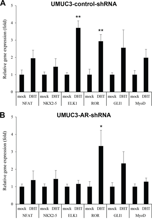 Figure 1: Effects of androgen on the expression of transcriptional factors in bladder cancer cells. UMUC3-control-shRNA A. or UMUC3-AR-shRNA B. treated with ethanol (mock) or 1 nM DHT for 24 hours were subjected to RNA extraction and subsequent real-time RT-PCR of NFAT, NKX2–5, ELK1, ROR, GLI1, and MyoD. Expression of each gene was normalized to that of GAPDH. Transcription amount is presented relative to that of mock treatment in each cell line. Each value represents the mean (+SD) from at least three independent experiments. *P < 0.05 (vs. mock treatment). **P < 0.01 (vs. mock treatment).