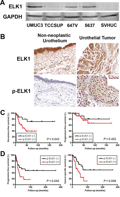 Figure 2: ELK1 expression in bladder cancer. A. Western blotting of ELK1 in urothelial cell lines. Total protein extracted from each cell line was immunoblotted for ELK1 (62 kDa). GAPDH (37 kDa) served as an internal control. B. IHC of ELK1 and p-ELK1 in non-neoplastic urothelium and urothelial tumor specimens. Kaplan-Meier analyses for recurrence-free/progression-free survival in patients with non-muscle-invasive tumor C. as well as progression-free/cancer-specific survival in patients with muscle-invasive tumor D., according to the levels of p-ELK1 expression.