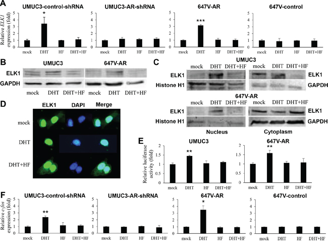 Cells plated onto 8-well chamber slides (NuncLab-Tek, Thermo Scientific) were cultured in medium containing ethanol, DHT, and/or HF for 24 hours. At the end of the drug treatment, the adherent cells were rinsed and fixed by 4% paraformaldehyde. The cells were then blocked with 1% bovine serum albumin for 1 hour at 37°C, and a primary antibody (ELK1; clone I-20; dilution 1:50) was added and incubated for 1 hour at 37°C. Fluorescence images were acquired with a fluorescence microscopy (EVOS FL Auto, Life Technologies).
