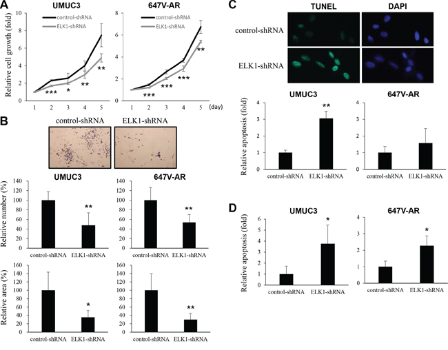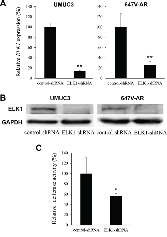 We investigated the expression of ELK1 in human urothelial carcinoma cell lines, UMUC3, TCCSUP, 647V, and 5637, as well as an immortalized human normal urothelial cell line, SVHUC, by western blotting (Figure 2A). ELK1 expression was found to be the strongest in UMUC3 and the weakest in SVHUC. No significant difference in ELK1 expression between UMUC3- control-shRNA and UMUC3-AR-shRNA or between 647V-AR and 647V-control was seen (data not shown).