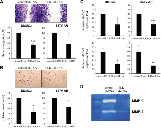Figure 6: Effects of ELK1 inactivation on bladder cancer cell migration and invasion. A. Wound healing assay in UMUC3-control-shRNA/ELK1-shRNA and 647V-AR-control-shRNA/ELK1-shRNA. The cells grown to confluence were gently scratched and the wound area was measured after 24-hour culture. The migration determined by the rate of cells filling the wound area is presented relative to that of each control line. Each value represents the mean (+SD) from at least three independent experiments. B. Transwell invasion assay in UMUC3-control-shRNA/ELK1-shRNA and 647V-AR-control-shRNA/ELK1-shRNA cultured in the Matrigel-coated transwell chamber. The number of invaded cells present in the lower chamber was counted under a light microscope (100x objective in five random fields). Cell invasion is presented relative to that of each control line. Each value represents the mean (+SD) from three independent experiments. C. Quantitative RT-PCR of MMP-2 and MMP-9 in UMUC3-control-shRNA/ELK1-shRNA and 647V-AR-control-shRNA/ELK1-shRNA. Expression of each specific gene was normalized to that of GAPDH. Transcription amount is presented relative to that of each control line. Each value represents the mean (+SD) from at least three independent experiments. D. Gelatin zymography in UMUC3-control-shRNA/ELK1-shRNA. The activity of MMP-2 or MMP-9 was indicated by clear zones of gelatin lysis against a blue background of stained substrate. *P < 0.05 (vs. control-shRNA). **P < 0.01 (vs. control-shRNA). ***P < 0.001 (vs. control-shRNA).