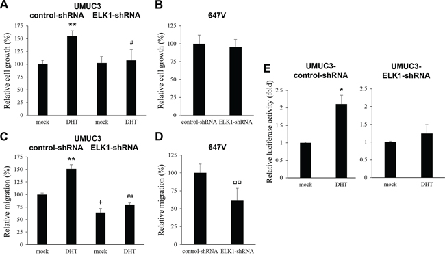Figure 7: Effects of androgen on the proliferation or AR activity in ELK1 knockdown bladder cancer cells. MTT assay in UMUC3-control-shRNA/ELK1-shRNA cultured for 5 days in the presence of ethanol (mock) or 1 nM DHT A. or in 647V-control-shRNA/ELK1-shRNA cultured for 5 days B. Cell viability is presented relative to that of mock-treated control line (A, lane 1) or that of control line (B) Each value represents the mean (+SD) from at least three independent experiments. Wound healing assay in UMUC3-control-shRNA/ELK1-shRNA in the presence of ethanol (mock) or 1 nM DHT C. in 647V-control-shRNA/ELK1-shRNA D. The cells grown to confluence were gently scratched and the wound area was measured after 24-hour culture. The migration determined by the rate of cells filling the wound area is presented relative to that of mock-treated control line (C, lane 1) or that of control line (D) Each value represents the mean (+SD) from at least three independent experiments. E. ELK1 luciferase reporter activity in UMUC3-control-shRNA and UMUC3-ELK1-shRNA transfected with pELK1-Luc and pRL-TK and subsequently cultured in the presence of ethanol (mock) or 1 nM DHT. Luciferase activity is presented relative to that of each line with mock treatment. Each value represents the mean (+SD) from at least three independent experiments. *P < 0.05 (mock vs. DHT in each line). **P < 0.01 (mock vs. DHT in each line). #P < 0.05 (control-vs. ELK1-shRNA lines with DHT). ##P < 0.01 (control-vs. ELK1-shRNA lines with DHT). +P < 0.05 (control-vs. ELK1-shRNA lines with mock treatment). □□P < 0.01 (control-vs. ELK1-shRNA lines).