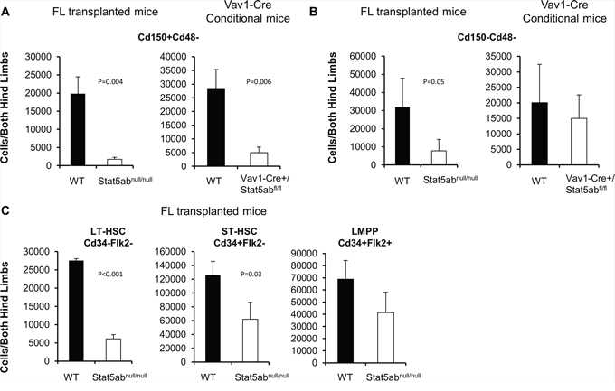Figure 1: Stat5-deficient HSCs have a lymphoid-biased phenotype with greatly reduced long-term HSCs. Bone marrow cells from either Vav1-Cre+/Stat5abfl/fl and littermates or wild-type and Stat5abnull/null fetal liver transplanted chimeric mice were assayed by multi-parameter flow cytometry to quantitate primitive HSC populations. Three separate experiments were performed with 3 to 5 mice per genotype compared. The absolute number of primitive HSC populations in bone marrow cells from both hind limbs is presented. A–B. Bone marrow was stained with antibodies against lineage markers, c-Kit, Sca-1, Cd150 and Cd48 antibodies. For fetal liver transplanted chimeric mice the donor Cd45.2 antibody was also included. C. Bone marrow isolated from fetal liver transplanted chimeric mice was analyzed by flow cytometry with antibodies against lineage markers, c-Kit, Sca-1, Cd34, and Flk2.