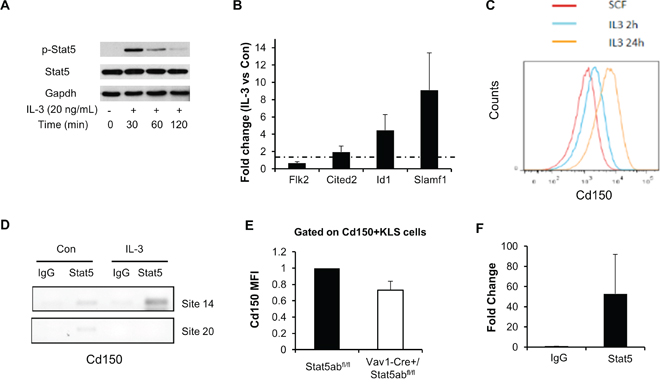 Figure 3: Stat5 activation directly regulates the myeloid differentiation marker Slamf1 in EML C1 and primary KLS cells. A. EML C1 cells were switched from maintenance culture media (SCF alone) to differentiation culture media (SCF + IL-3) and phosphorylation of Stat5 was determined by Western blotting in cells grown under both conditions. B. Real-time PCR analysis of EML C1 cells 2 h after in vitro IL-3 exposure. Data presented (averages of four separate experiments) are fold changes of genes in IL-3 treated vs. SCF alone after the normalization to GAPDH control using ΔΔCt method. Error bars represent standard deviation. C. Staining for Cd150 in EML C1 cells after 2 h and 24 h in vitro IL-3 exposure. Cells were gated on Cd150+KLS cells. D. Stat5 was immunoprecipitated from formaldehyde-cross-linked lysates prepared from EML C1 cells treated with or without IL-3 for 2 h. Binding of Stat5 to putative Stat5 consensus binding sites 14 and 20 (control) in the Slamf1 gene was determined by PCR amplification of immunoprecipitated DNA. Nonspecific binding was assayed by rIgG isotype-control immunoprecipitation of cross-linked lysates. Results are representative of 2 independent experiments. E. Mean fluorescence intensity (MFI) of Cd150 in Cd150+KLS of Vav1-Cre/+Stat5abfl/fl and Stat5abfl/fl mice. Results are the average from four independent experiments and were normalized to Cd150 MFI for Stat5abfl/fl mice. F. Stat5 was immunoprecipitated from formaldehyde-cross-linked lysates prepared from about 1 million sorted wild type mice KLS cells. Binding of Stat5 to putative Stat5 consensus binding site 14 in the Slamf1 gene was determined by real time PCR amplification of immunoprecipitated DNA (n = 3, p = 0.08).