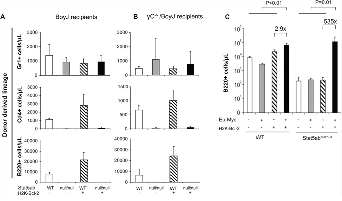 Figure 5: Expansion of peripheral blood Stat5-deficient B-cell precursors by the combined expression of Myc and Bcl-2. Flow cytometry analysis of B-, T-, and myeloid cell development in Stat5abnull/null fetal liver transplanted recipients alone or combined with transgenic H2K-Bcl-2 expression. E14.5 fetal liver cells (wild-type (WT), Stat5abnull/null (null/null), H2K-Bcl-2, or H2K-Bcl-2/Stat5abnull/null) were obtained from timed mating of H2K-Bcl-2/Stat5ab+/null x Stat5ab+/null genetic crosses. All donor mice used for these experiments were backcrossed to the C57BL/6 background and were transplanted into lethally irradiated Boy J recipients (A) or lethally irradiated common γC−/− mice (BoyJ background) (B) at a ratio of 1 donor fetal liver to 5 recipient mice. 16 weeks after the fetal liver transplantation, recipient mouse peripheral blood was analyzed for the percentage of donor derived cells in the myeloid lineage (Gr1+), T-cell lineage (CD4+) and B-cell lineage (B220+) along with the donor CD45.2 marker. The absolute numbers of donor-derived leukocytes (Gr-1+, B220+, CD4+) in each lineage are represented. Results are combined from two independent fetal liver transplantation experiments (total 10 recipient mice per genotype per recipient background). C. Wild-type, Stat5abnull/null, and Stat5abnull/null +/- Myc/Bcl-2 transgenic fetal liver cells were transplanted into lethally irradiated BoyJ mice. Four weeks after the transplantation, mice were analyzed for peripheral blood hematology. B220+ cells from transplanted mice 4 weeks after transplantation (n = 5 for each genotype) showed a dramatic increase in the absence of Stat5.