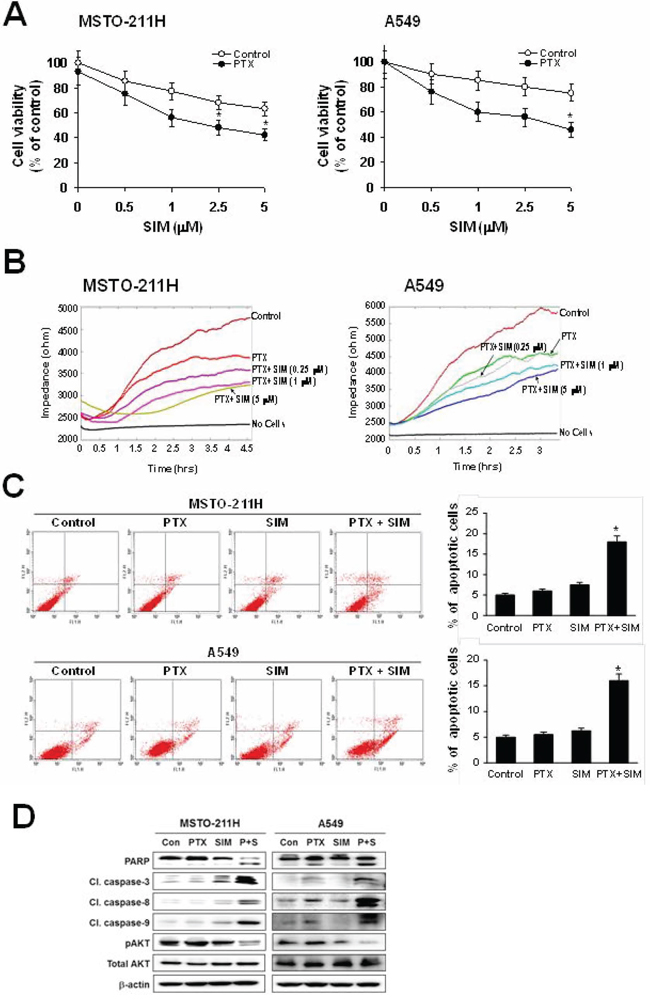 Figure 1: Inhibitory effects of pemetrexed and simvastatin cotreatment on the proliferation and apoptosis. A. Cells were treated with different concentrations of simvastatin (SIM) in the absence or presence of 1 μM pemetrexed (PTX) for 48 h, and viability was then measured by the MTT assay. The viability of control cells was set at 100%, and the cell survival of treated cells relative to the control cells is presented. The data represent the mean ± S.D. of three independent experiments. *p < 0.05 compared to the control. B. Cells were treated with different concentrations of simvastatin in the presence of 1 μM pemetrexed. Proliferation analysis was performed using the electrical cell-substrate impedance sensing system (ECIS). Resistance was measured at 6400 Hz every 10 minutes for a period of 48 hours. During the experiments, cultures were maintained at 37°C and 5% CO2 in air. C. Cells were incubated with 1 μM pemetrexed and/or 5 μM simvastatin for 24 h, and apoptosis was evaluated by green fluorescent protein-annexin V + propidium iodide. The percentage of annexin V and propidium iodide positive cells in control cells was set at 100%, and the percentage of apoptosis relative to that of the control is presented. The data represent the mean ± SD of three independent experiments. *p < 0.05 compared to control. D. Cells were treated with pemetrexed and simvastatin, alone and in combination for 24 h. Then the cells were lysed, and the cell lysate was subjected to 12% SDS-PAGE to measure the expression of the indicated proteins. Data are representative of two independent experiments.