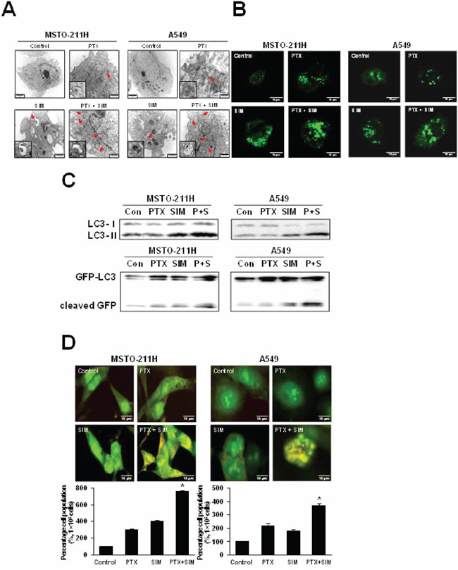 Autophagic induction by combination of pemetrexed cotreatment and simvastatin was further confirmed by transient transfection of green fluorescence protein (GFP)-LC3-II plasmid DNA. In non-treated control cells, a diffuse pattern of GFP fluorescence was observed in the cytoplasm; however, MSTO-211H and A549 cells treated with both pemetrexed and simvastatin displayed markedly more LC3-positive GFP punctae in compared to cells treated with pemetrexed or simvastatin alone (Figure 2B).