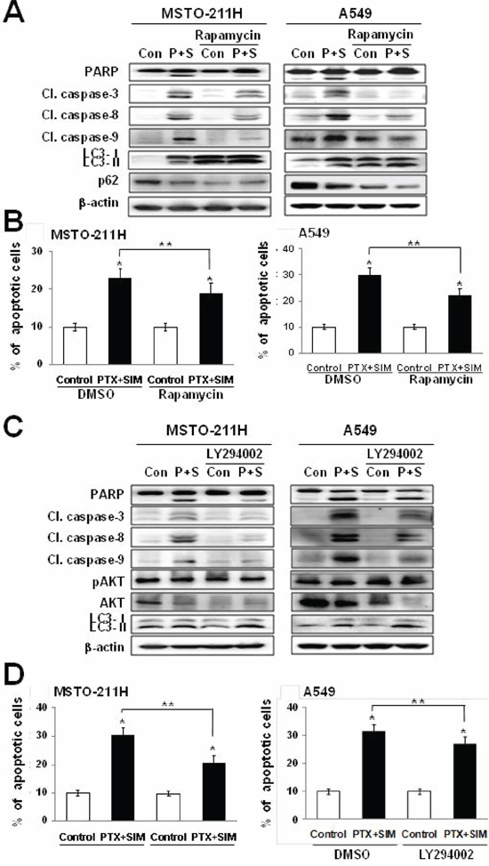 Figure 4: Activation of autophagy decreases pemetrexed and simvastatin-induced apoptosis. A. Cells were treated with 1 μM pemetrexed and 5 μM simvastatin in the absence or presence of 20 nM rapamycin. The cell lysates were subjected to 12% SDS-PAGE to measure the expression of the indicated proteins. C. Cells were treated with 1 μM pemetrexed and 5 μM simvastatin in the absence or presence of 10 μM LY294002. The cell lysates were subjected to 12% SDS-PAGE to measure the expression of the indicated proteins. B. and D. Apoptosis was evaluated as described in Figure 1C. The data represent the mean ± SD of three independent experiments. *p < 0.01 compared with the control, ##p < 0.05 compared with the pemetrexed and simvastatin group.