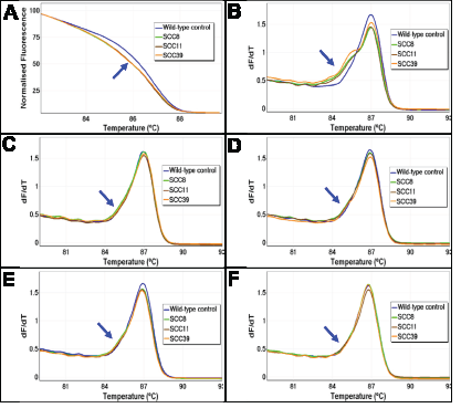 Figure 1: The melting profiles of FFPE DNA before and after UDG treatment. The melting profiles of the AKT1 HRM assay for three representative FFPE DNA samples (SCC8, SCC11, and SCC39) without (Panels A and B) and with UDG treatment using four different UDG concentrations (Panels C – F) are shown. The early melting profiles that are indicative of heteroduplex formation were seen in all three samples without UDG treatment. UDG treatment prior to PCR amplification resulted in a marked reduction of heteroduplex formation. Panel A: Normalised plot without UDG treatment. Panel B: First negative derivative plot without UDG treatment. Panels C – F: First negative derivative plots with a concentration of 0.1, 0.25, 0.5, and 1 UDG unit/reaction, respectively. The early melting region of the heteroduplexes is indicated with a blue arrow.