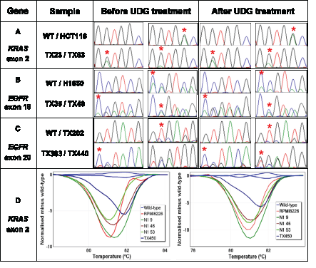 Figure 5: Detection of true KRAS and EGFR mutations after UDG treatment. The effect of UDG treatment on detection of various types of true mutations are examined using a set of FFPE DNA samples harbouring either KRAS or EGFR exon 19 deletions and exon 20 insertion mutations. All KRAS-mutant and EGFR-mutant samples are correctly identifiable by HRM or Sanger sequencing regardless of UDG treatment. The positions of KRAS mutations and representative nucleotides of EGFR mutations are indicated by a red asterisk. Panel A: Sequence traces of KRAS exon 2 before and after UDG treatment. Both TX23 and TX63 samples harbour KRAS c.35G>A mutations and HCT116 cell line DNA contains a KRAS c.38G>A mutation. Panel B: Sequence traces of EGFR exon 19 before and after UDG treatment. Both TX35 and H1650 harbour EGFR p.E746_A750del mutations and TX48 harbours a p.T751_I759delinsN mutation. Panel C: Sequence traces of EGFR exon 20 before and after UDG treatment. TX202, TX383 and TX440 samples harbour EGFR p.C775_R776insPA, p.H773_R776insYNPY, and p.D770_H773insGSVD, respectively. Panel D: Difference plots of low-level KRAS-mutant samples before (left) and after UDG treatment (right). KRAS mutations detected are c.35G>T (N1 9), c.35G>T (N1 46), c.35G>C (N1 53), c.34G>T (TX450). RPMI8226 cell line DNA contains a KRAS c.35G>C mutation.