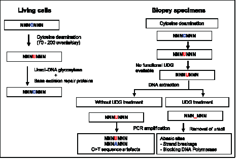Figure 6: Uracil lesions in FFPE DNA leading to sequence artefacts and in vitro removal of uracil by uracil-DNA glycosylase. Spontaneous cytosine deamination is a frequent DNA damage that takes place at a rate of 70 - 200 events per day in the human genome. In normal cells, the resulting uracil lesions are effectively removed by UDG. The resulting abasic sites are then repaired by the base excision DNA repair system. However, in biopsy specimen, if cytosine deamination occurs during sample collection, formalin fixation, and fixed tissue storage, the resulting uracil lesions cannot be repaired due to the absence of functional DNA repair proteins. When DNA is extracted from the tissue with uracil lesions and then used as template for PCR amplification, transitional C:G>T:A sequence artefacts are generated as uracil efficiently pairs with adenine. The generation of artefactual C:G>T:A transitions from the uracil lesions in FFPE DNA can be effectively eliminated by treating FFPE DNA with UDG in vitro prior to PCR amplification. Abasic sites generated by the removal of uracil bases may reduce the extension by DNA polymerase and strand breakage during the repetitive exposure to high temperature during PCR cycling. Thus, treatment of FFPE DNA with UDG prior to PCR amplification eliminates the generation of artefactual C:G>T:A transitions arising from uracil lesions.