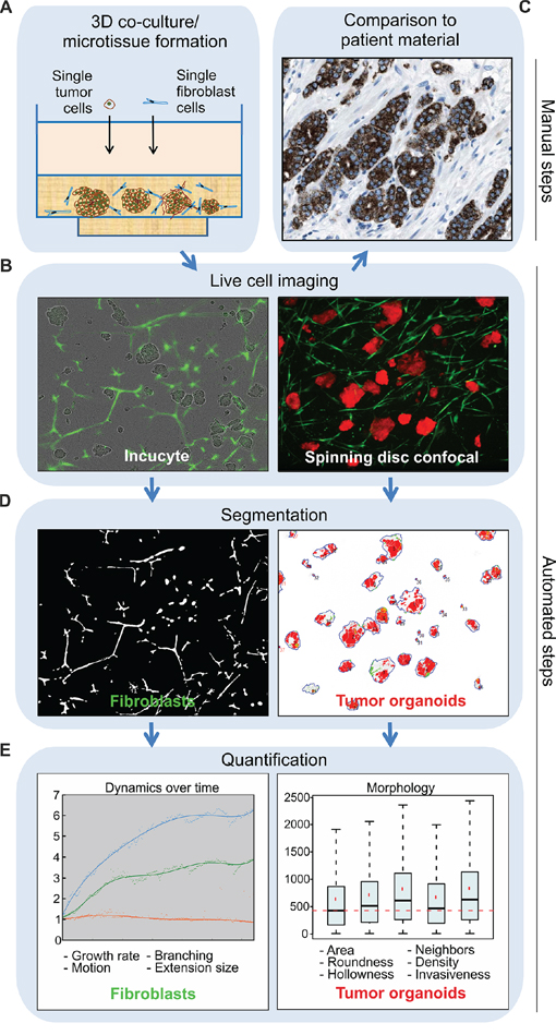To model the heterotypic cell–cell interactions between tumor and stroma, and to explore how fibroblasts affect the tumor growth and morphology over time, an automated image analysis approach for tracking 3D co-cultures in real-time was established (Figure 1). We generated miniaturized tumor-fibroblast co-cultures in ECM that can be perturbed and observed by live-cell microscopy (Figure 1A–1B), in order to mimic complex tumor architecture (Figure 1C). The microscopic images were segmented, using different adaptations for both cell types. For fibroblast sequences, local adaptive thresholding was used [26], while tumor organoids were traced using our automated image data analysis software (AMIDA) [27] (Figure 1D). Fibroblasts were quantified from fluorescent phase contrast image sequences to track dynamic changes for over two weeks. Quantification of tumor organoids from maximum projection confocal images was performed to detect phenotypic changes in response to molecular perturbations (Figure 1E). This analysis pipeline allows simultaneous automated imaging, segmentation and quantification of both cell compartments (Figure 1). It can be utilized for functional cancer target validation, chemosensitivity testing or high-content screening purposes, when the impact of tumor/stroma interactions is investigated.
