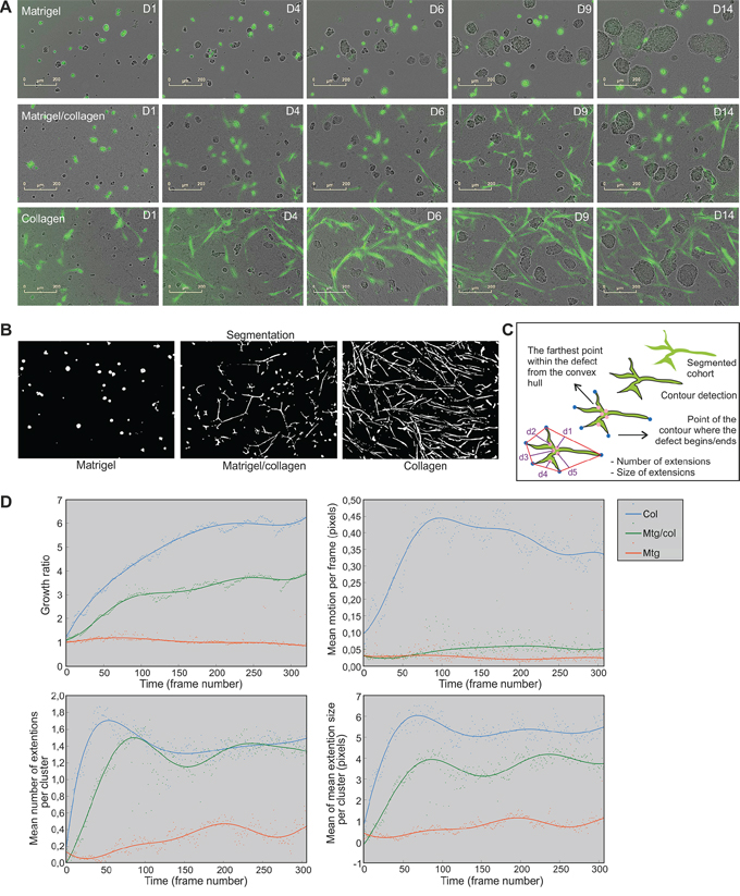 Figure 2: Collagen is required for CAF cohort growth, movement and branching in 3D co-cultures. A. Incucyte FLR real-time live-cell imaging of LNCaP organoids (phase contrast) and PF179T CAFs (green) co-cultured for 14 days in Matrigel, Matrigel/collagen mixture and collagen. Scale bar: 200 μm. B. Fibroblast morphology and dynamics was analyzed from the time-lapse images in an automated fashion. CAF cohort segmentation was performed by local adaptive thresholding and example images of segmented CAFs in three matrices are described. C. Schematic drawing depicts how branching of each CAF cohort was assessed by extracting the closed contour and detecting the convex hull of the contour as well as contour convexity defects. D. Quantification of fibroblast growth rate (area), motion per frame, number of extensions per cluster and extension size per cluster, is shown over time. Every dot represents a value per each time frame of the image sequence. Segmented real-time live-cell image sequences from three different ECMs were used for quantification. Col: collagen, Mtg/col: Matrigel/collagen 1:1 mixture, Mtg: Matrigel.