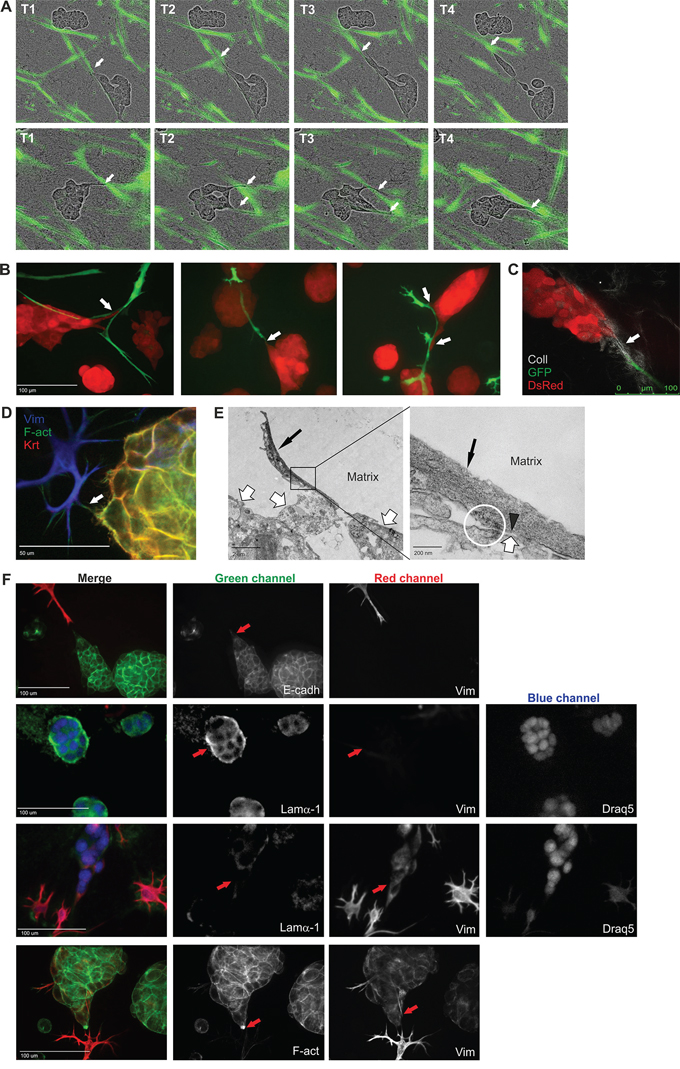 Figure 3: CAFs remodel the ECM and facilitate tumor cell invasion. A. Two example sequences of Incucyte FLR real-time live-cell imaging of LNCaP cells (phase contrast) and PF179T CAFs (green), co-cultured in Matrigel/collagen mixture. CAFs appear to pull the matrix and lead the way for tumor cells to invade. White arrows depict tumor-stroma interaction. T: timepoints, captured with 4 h intervals. B. Confocal live-cell images of tumor stroma interactions. Tumor cells follow the fibroblast tracks. Red: dsRed-LNCaP, green: GFP-PF179T CAFs. White arrows depict tumor-stroma interaction. Scale bar: 100 μm. C. Second-harmonic generation microscopy image of collagen-mediated tumor-CAF connection. Red: dsRed-LNCaP, green: GFP-PF179T CAFs, grey: collagen fibers. Scale bar: 100 μm. D. IF staining implying direct contact between tumor and stromal cells. Arrow depicts tumor-stroma interaction. Vimentin (Vim): mesenchymal cell marker, Pan-keratin (Krt): epithelial cell marker, F-actin (F-Act). Scale bar: 50 μm. E. Left panel: high-resolution transmission electron microscopy (TEM) images, showing direct tumor and stromal cell contact. Thin black arrow depicts α-smooth muscle actin (α-SMA)-rich CAF, thick white arrow depicts tumor organoid. Scale bar: 2 μm. Right panel: Marked area in the left panel is blown up. Black arrowhead points to α-SMA-rich cytoskeleton in the CAF, directly adjacent to the tumor cell membrane. The circle highlights electron dense material, indicating cortical actin accumulation, a hallmark of cell-cell contacts. Scale bar: 200 nm. For the complete TEM panel, see Supplementary Figure S3. F. Representative IF-stainings displaying CAF-promoted tumor invasion. Tumor cells lose both the E-cadherin expression (panel 1) and the basal lamina (panel 2 and 3) in the organoid protrusion, in response to nearby CAFs starting to pull the matrix. Instead, the tumor protrusion expressed vimentin (panel 3 and 4) and an accumulation of actin is observed in the invasive tip (panel 4). Vimentin (Vim): mesenchymal cell marker, E-cadherin (E-cadh): epithelial cell marker, Laminin-α1 (Lamα1): basal lamina, F-actin (F-Act), Draq5: nuclear stain. Red arrows depict the important details. The separate channels are displayed in black and white. All channels are shown in color in the merged images. Scale bar: 100 μm.