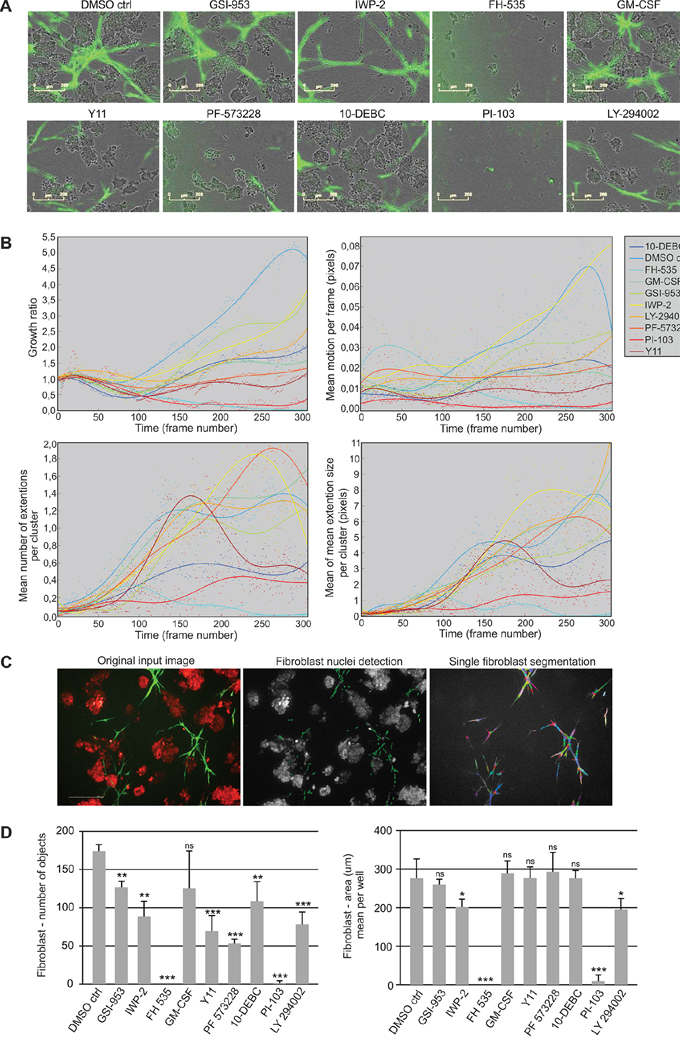 Figure 5: Small molecule inhibitors block growth and dynamics of fibroblasts in 3D co-culture. A. Representative live-cell images of LNCaP (phase contrast) and GFP-PF179T cells (green) co-cultured in Matrigel/collagen mixture, treated with inhibitors (3 μM) or GM-CSF (0.3 ng/ml). For description of perturbants, see Table 1. Scale bar 200 μm. B. Quantification of perturbants’ effects on fibroblast growth rate (area), motion per frame (motility), extension size per cluster and number of extensions per cluster (branching), is shown over time. Segmented real-time live-cell image sequences were used for the quantification. Every dot represents a value per each time frame of the image sequence. C. Segmentation of single fibroblasts using dual labeled, Histone 2B-mCherry/GFP-PF179Ts, together with dsRed-LNCaP cells. All the fibroblast nuclei (green: mCherry) were selected and their surrounding cytoplasm was detected by the overlay of the GFP signal from the fibroblasts (shown in different colors). The segmentation was performed using the PE Harmony software. D. Quantification of the effect of perturbants on single fibroblast number and area. Spinning disc confocal images taken at the end point (day 14) were used for quantification. Error bars depict SD. P-values * P < 0.05, **P < 0.01, *** P < 0.001, ns: not significant, by Student t-test.