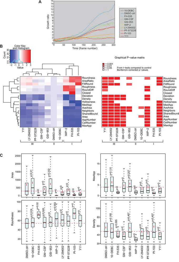 Figure 6: Inhibition of cancer-associated molecules affects growth and morphology of tumor organoids in 3D co-culture. A. LNCaP tumor organoid growth was analyzed from Incucyte FLR time-lapse images in an automated fashion. Quantification of tumor fibroblast growth rate (area) is shown over 14 days. B. Classification of morphological changes in tumor organoids by the use of small molecule inhibitors (3 μM) or GM-CSF (0.3 ng/ml). Three distinct groups of tumor phenotypes are marked with roman numerals (I, II and III). Heatmap and graphical P-value matrix summarizes the altered parameters from the AMIDA analysis. Values are color-coded as red (increased) and blue (decreased), relative to the control. For explanation of morphometric parameters, see Supplementary Table S1. P-values are Bonferroni-corrected from t-tests and compared to DMSO control treatment (DMSO ctrl). C. Box and whisker plots of selected parameters from the heatmap. Area describes the size of the segmented structure in pixels, Roundness is a measure of loss of the round organoid phenotype, in percentage, MaxApp is an estimate for the maximum length of appendages of the segmented structure, and Density is measured as the intensity of the red channel for the segmented structure. P = 0 indicates P-values < 0.001.