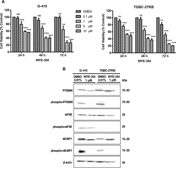 Figure 1: In vitro effects of WYE-354 on cell growth and mTOR signaling pathway in two gallbladder cancer cell lines. A. G-415 and TGBC-2TKB cells were treated with increasing concentrations of WYE-354. Cell viability was determined after 24, 48, and 72 hours of treatment. Data are shown as mean ± SD of at least three independent experiments in quintuplicate (**P < 0.01; ***P < 0.001; ns: not significant). B. G-415 and TGBC-2TKB cells were treated with WYE-354 (1 μM), for 18 hours. Control cells received an equivalent amount of solvent (0.01% dimethylsulfoxide). Western blot analysis was carried out using antibodies against the total and phosphorylated portion of P70S6K, 4E-BP1, and eIF4E proteins. Protein loading was normalized using an antibody recognizing β-actin.