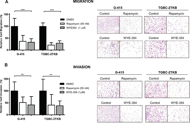 Figure 2: Effect of WYE-354 and rapamycin on cell migration and invasion. A. Migration and B. invasion assays were performed using 24-well transwell plates containing polycarbonate filters with an 8 μm pore size. Before seeding, G-415 and TGBC-2TKB cells were exposed to WYE-354 (1 μM), rapamycin (50 nM) or dimethylsulfoxide (0.01%) (control) for 12 hours at 37°C. Cells were counted in six randomly selected fields after 24 hours. Results are expressed as mean ± SD (**P < 0.001; ***P < 0.001).