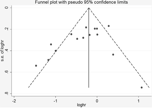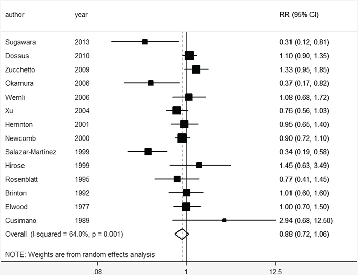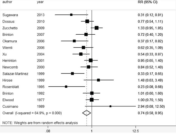 Moderate between-study heterogeneity was found in this analysis. Exploratory univariate meta-regression was performed with the covariates of published year, study area, study type, cases and sample size. However, results showed that no covariate had a significant impact on between-study heterogeneity (published year: p = 0.354, study region: p = 0.879, study type: p = 0.441, cases: p = 0.143, sample size: p = 0.911). The ‘leave one-out’ sensitive analysis [33] was carried out to assess the key studies contributed to this high between-study heterogeneity. After excluding three articles conducted by Rosenblatt KA et al [21], Salazar-Martinez E [22] and Zucchetto A [29], no significant heterogeneity (I2 = 42.1%, p > 0.05) was found, and the pooled RR was 0.78 (95% CI 0.64–0.96).