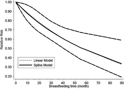Figure 4: The dose–response analysis between breastfeeding and EC risk with restricted cubic splines in a multivariate random-effects dose–response model. The solid line and the long dash line represent the estimated relative risk and its 95% confidence interval. Short dash line represents the linear relationship