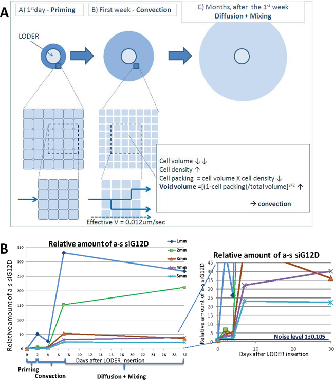 Figure 1: Drug transport is described as occurring in three consecutive steps: ‘priming’, ‘convection’ and ‘diffusion + mixing’. The drug that is released at an earlier stage, typically the first day, paves the way for the subsequent distribution of more drug molecules at later times by modifying the microenvironment physiological conditions A–B. (A) Model (B) The graphs show the average relative level of antisense (a-s) siG12D detected at days 0, 2, 4, 7 and 30, at concentric rings of 1 mm width and radius of 1, 2, 3, 4 and 5 mm from the LODER™. Each point shows an average of at least two independent measurements. Methods: subcutaneous (SC) or orthotopic Panc-02 tumors were treated with siG12D-LODER™. As the presented model is general for solid tumors, we use here data obtained in SC and orthotopic models. Two, four and seven (in SC model) or 30 (in orthotopic model) days after the insertion, mice were sacrificed, tumors were formalin fixed and paraffin embedded (FFPE), and tissue sections of 5 μm were prepared. RNA was extracted at a certain distance from LODER™. Relative amounts of siG12D antisense strand were measured using Real-Time PCR. RNU6 microRNA was used as an endogenous control. siG12D levels were calculated relative to the detected level in untreated or placebo-LODER™-treated tissues.