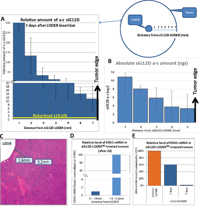 Figure 2: SC or orthotopic Panc-02 tumors were implanted with siG12D-LODER™. Two, four, seven and 30 days after the insertion, mice were sacrificed, tumors were subjected to FFPE, and tissue sections of 5 μm were prepared. RNA was extracted at certain distances from LODER™. Relative amounts of siG12D antisense (a.s.) strand was measured using Real-Time PCR. RNU6 microRNA was used as endogenous control. siG12D levels were calculated relative to the detected levels in untreated or placebo-LODER™-treated tissues. A. Average relative detected levels of antisense siG12D ± SEM at certain distances from the LODER™ at day 7 (presented here is a representative case – the values of two, four, seven and 30 days are presented in Figure 1B). B. Absolute levels of antisense siG12D ± SEM detected at day 7 at 1, 2, 3, 4 and 5 mm distances from the siG12D-LODER™. C–E. Relative quantitation of KRAS mRNA (normalized to HPRT) in siG12G-LODER™-treated tumor tissues. (C) Representative histological slide showing measurement areas. (D) Relative amount of KRAS mRNA as a function of distance from siG12D-LODER™. Shown here are representative results of treated tissue. (E) Relative KRAS mRNA levels as detected at two and seven days after LODER™ insertion. The results were normalized to the level in placebo-LODER™-treated tissue seven days after the insertion. Shown here are representative results of treated tissues.