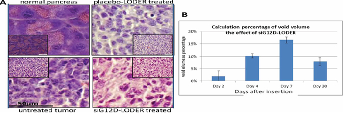 In an additional study we tested the effect of siG12D-LODERTM vs. siLuc-LODER™. LODERs were intratumorally inserted into subcutaneous tumors originated from Capan1 cells constitutively expressing luciferase gene. Mice were sacrificed twenty days post treatment, and tumors histology tissue slides were analyzed. The results reveal that siG12D-LODERTM generates an increase of 17.75% +/− 4.34% in void volume, while siLuc-LODER™ presents none or a very small increase of 2.98% +/− 2.96% in void volume, perhaps an off-target and/or immune result of the non-specific siLuc.