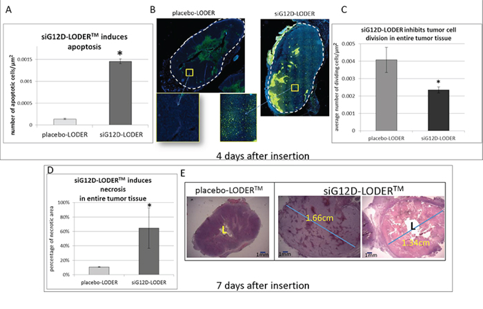 Cell apoptosis and necrosis can explain the increase in void volume. We've noted that after one week levels of mRNA siG12D are significantly reduced as compared to the levels after two days (Figure 2E). We estimated the amount of cell death by measuring apoptotic and necrotic tissue fractions. Here, SC syngeneic models were used. Tumors were intratumorally inserted with siG12D-LODER™ or placebo-LODER™. Immunohistological staining results of tumor tissues collected one week after the LODER™ insertion, revealed that in siG12D-LODER™-treated tumors significant induction of apoptosis (Figure 4A–4C) and necrosis (Figure 4D–4E) were detected [21].