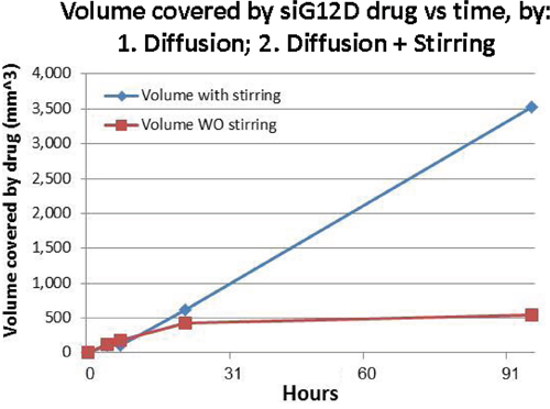 To evaluate the importance of drug distribution for the siG12D drug by diffusion and mixing, as compared to diffusion only, we performed an in-vitro test of diffusion with and without mixing. We used 90RPM horizontal stirring of the siG12D drug in a two-dimensional model diffusion experiment in a 3% Acrylamide gel. The area covered by drug was measured at time points 0, 4, 7, 21, and 96 hr. Figure 5 depicts the average volume(= 4/(3*sqrt(π))*(measured area)3/2) in mm3. As shown, after the first day, diffusion is practically halted so that a volume of 1 cm3 will never be covered. By using the diffusion approximation for average displacement