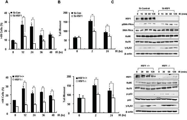 Since our HSF1 binding partners screening assay revealed that Ku70 and Ku86 were the binding partners for HSF1, we examined damage responses after IR in cells with or without HSF1. RNA interference against HSF1 (Si-HSF1) in HOS cells (p53 defective and high HSF1 expressing cells) resulted in decreased aneuploidy production and Comet tail moments in IR-treated cells. HSF1 knockout MEF cells (HSF1−/−, p53 wild type and high HSF1 expressing cells) also showed similar effects (Figure 1A and 1B). When DNA damage repair proteins such as DNA-PKcs, p53, and γ-H2AX were examined, HSF1 knockdown cells showed increased phosphorylation of these proteins (Figure 1C). HSF1−/− cells showed increased cell death in response to IR relative to wild-type cells (HSF1+/+), when cell death and cleavage of caspase-3 or PARP1 were evaluated (Supplementary Figure 1). Consequently, this suggested that HSF1 is involved in a defective DNA repair pathway and results in an accumulation of DNA strand breaks and aneuploidy in response to IR, as well as in protection from IR-induced cell death.