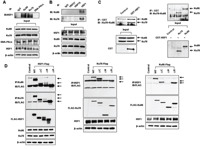 Figure 2: HSF1 interacts with both Ku70 and Ku86. A, B. Western blotting was conducted following immunoprecipitation using HOS cell extracts. C. Glutathione-S transferase (GST) pull-down assays were performed by mixing GST-HSF1 fusion proteins (left) and in vitro translated Ku70/Ku86 proteins were incubated with GST-HSF1 and immunoprecipitates were subjected to an in vitro binding assay (right). D. Various deletion constructs of Flag-tagged HSF1 along with Ku70 and Ku86 constructs were transiently transfected into HEK298T cells. Western blotting was performed following immunoprecipitation using cell extracts.