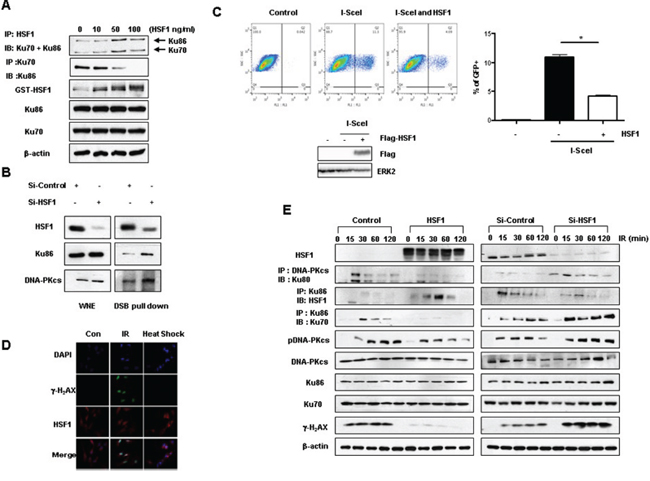 Figure 3: HSF1 inhibits binding activity between Ku70 and Ku86. A. Purified recombinant HSF1-GST proteins (0, 10, 50, and 100 ng/ml) were added to HOS cell extracts. After 16 hrs, western blotting was performed following immunoprecipitation using cell extracts. B. Si-Control or Si-HSF1 (30 nM) transiently transfected into HOS cells. The protein levels of HSF1, Ku86 and DNA-PKcs in the dsDNA pull-down lysates, as well as in complete whole-nuclear extracts (WNE), were analyzed. C. GFP+ cells with mock or HSF1 expression in U2OS cells stably expressing EJ5-GFP were determined by FACS analysis. GFP+ cells were graphically presented. HSF1 expression level was determined by immunoblotting with Flag. ERK2 was used for equal loading control. *p < 0.05. D. HOS cells were irradiated (5 Gy) or heat shock (42°C) for 1 h and stained for HSF1 (red), γ-H2AX (green), and DAPI. Cells were analyzed using immunofluorescence microscopy. E. HOS cells were transiently transfected with Si-Control or Si-HSF1 (30 nM) and control or HSF1 wild type plasmids. Cells were then exposed to a dose of 5 Gy IR and immunoblotting or immunoprecipitation were performed at the indicated time points.
