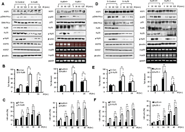 Figure 4: Knockout of Ku70 or Ku80 shows a pattern similar to HSF1 overexpression. A. Si-Control or Si-Ku86 (30 nM) transfected HOS cells and Ku80 defective cells were exposed to doses of 5 and 10 Gy IR. Western blotting and RT-PCR were performed at the indicated time points. B, E. The presence of DSBs was determined using the Comet assay. C, F. The percentage of the DNA content of cells was measured by flow cytometry. D. Si-Control or Si-Ku70 (30 nM) transfected HOS cells and Ku70 knockout cells were exposed to a dose of 5 and 10 Gy IR. Western blotting and RT-PCR were performed at the indicated time points. Each data point represents the mean ± SE of three experiments. Significantly different from the corresponding control cells at *p < 0.05. **p < 0.01.