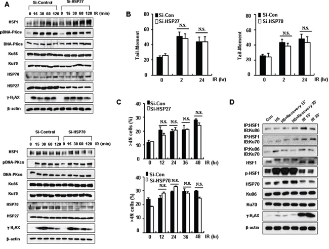 Figure 5: HSF1-mediated defective repair activity is independent of its transcriptional activity. A. Western blotting or immunoblotting of Si-HSP27 or Si-HSP70 transfected HOS cells extracts was conducted at the indicated time points following treatment of cells with an IR dose of 5 Gy. The results represent one of three independent experiments. B. DSBs were determined through use of the Comet assay. C. The percentage of the DNA content of cells was measured by flow cytometry. Each data point represents the mean ± SE of three experiments vs control. D. HOS cells were heat shocked (HS) for 30 min at 42°C followed by indicated recovery times or exposed IR (5 Gy). Total proteins were analyzed for Western blotting or immunoprecipitation.