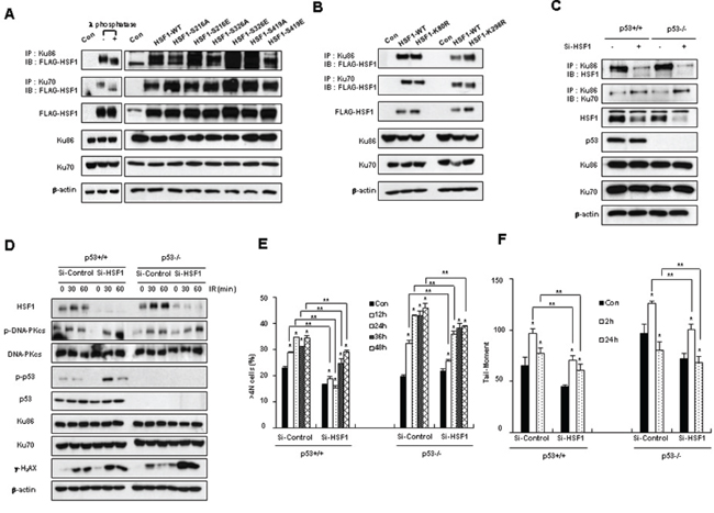 Figure 6: Posttranslational modification of HSF1 and cellular p53 status does not affect the interaction of HSF1-Ku70 or HSF1-Ku86. A. Ku70 or Ku86 immunoprecipitations were performed, and each immunoprecipitation reaction mixture was either mock treated (−) or treated with lambda phosphatase (+) (left). Control and Flag-HSF1 phospho-mutant constructs were transfected into HEK293T cells and western blotting or immunoblotting was conducted following immunoprecipitation on cell extracts (right). B. Control and Flag-HSF1 acetylation-defective mutant or HSF1 sumoylation mutant constructs were transfected into HEK293T cells and Western blotting was performed following immunoprecipitation on cell extracts. C, D. Si-Control or Si-HSF1 transfected HCT116 (p53+/+ and p53−/−) cells were exposed to a dose of 5 Gy IR. Western blotting was performed following immunoprecipitation using cell extracts. E. The percentage of the DNA content of cells was measured. F. The presence of DSBs was determined using the Comet assay. Each data point represents the mean ± SE of three experiments. Significantly different from the corresponding control cells at *p < 0.05. **p < 0.05.