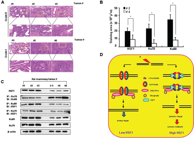 Figure 7: HSF1 expression correlates with aggressive malignancy in rat mammary tumors. H&E staining A. and staining for HSF1, Ku70 and Ku80 B. in rat mammary adenocarcinomas. Statistical significance from rat mammary tumors was set to *p < 0.05. **p < 0.01. C. Western blotting was performed following immunoprecipitation using rat mammary tumor tissue extracts. D. Hypothetical scheme that HSF1induces defective repair activity by interfering with the interaction between Ku70 and Ku86.