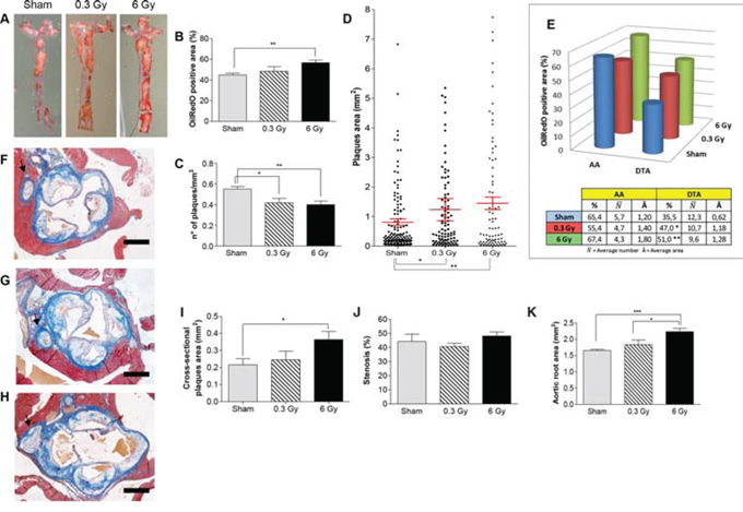 Figure 3: Chronic irradiation. A. Representative ORO-stained aortas from female ApoE−/− mice after chronic irradiation with 0.3 Gy or 6 Gy over 300 days, and age-matched controls. Graphic representation of quantitative analyses performed on digital images from en face preparations of aortas (n = 8) showing: B. Percentage of ORO-stained aortic area. C. Plaque density. D. Plaques size. E. Regional distribution. F–H. Masson's trichrome staining of aortic root cross-sections from each experimental group. I–K. Dimensional analyses of plaques area (I), aortic stenosis (J) and aortic total area (K). Data are shown as mean ± SEM. Differences were tested with Student's t-test. *P < 0.05; **P < 0.001; ***P < 0.0001. Arrows: coronary artery. Bars: 500 μm.