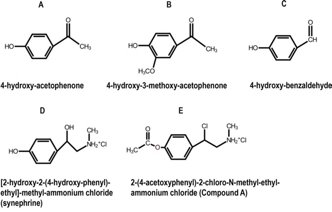Figure 1: Chemical structures of selected phenolic compounds from S. tuberculatiformis, and their synthetic analog, Compound A. A–C. Chemical structures of selected bio-active phenolic compounds isolated from S. tuberculatiformis Botch extracts, D. an inactive compound, [2-(hydroxy)-2-(4-hydroxyphenyl)-ethyl]-methyl ammonium chloride (synephrine), and E. a synthetic analog 2-(4-acetoxyphenyl)-2-chloro-N-ethyl ammonium chloride (Compound A). See also [111] for additional details.