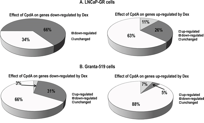 Figure 2: Global CpdA effect on the expression of glucocorticoid-responsive genes in epithelial and lymphoid cells. A. LNCaP-GR cells were treated with vehicle (EtOH), glucocorticoid Dexamethasone (Dex, 1 uM) or CpdA (5 uM) for 8 h; B. Granta-519 cells expressing endogenous GR, were treated with vehicle, Dex (1 uM) or CpdA (1 uM) for 16 h. Total RNA was extracted, and global gene expression changes were evaluated by Illumina DNA arrays (three individual RNA samples/group). Expression changes with fold change > 1.5, and p-value < 0.05 were considered biologically and statistically significant. Effect of CpdA on Dex-regulated genes: down-regulation (black); up-regulation (grey), no change (white).