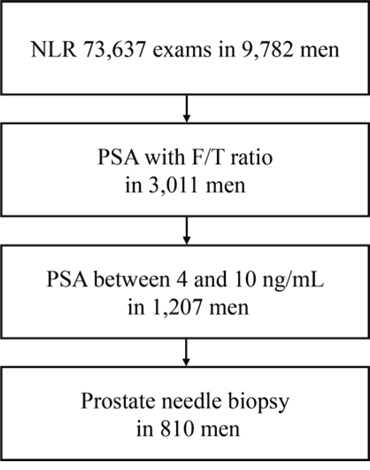 A total of 73,637 CBC exams including absolute neutrophil and lymphocyte counts were performed in 9,782 men at the Department of Urology, Yokohama City University Hospital (Yokohama, Japan) from 1999 to 2015. Of these, 3,011 men had both CBCs and F/T PSA ratio. We further investigated 810 men who underwent prostate needle biopsy while showing PSA levels between 4 and 10 ng/mL [Fig 1]. Patients' age, NLR, PSA, and F/T PSA ratio are summarized in Table 1. The institutional review board of Yokohama City University approved this study.