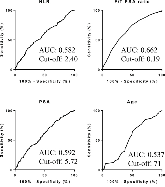 NLR was calculated using neutrophil and lymphocyte counts via CBCs obtained simultaneously with PSA and its F/T ratio. Prostate needle biopsy was typically performed within 4 weeks of blood tests. In some cases, prostate needle biopsy was not performed due to, for instance, the presence of urinary tract infection such as acute prostatitis, unsuspicious findings in pre-biopsy MRI, or advanced ages. We determined the cut-off point of NLR according to the sensitivity and specificity levels derived from area under receiver operator characteristics (AUROC) curve plotted using the presence or absence of prostatic carcinoma.